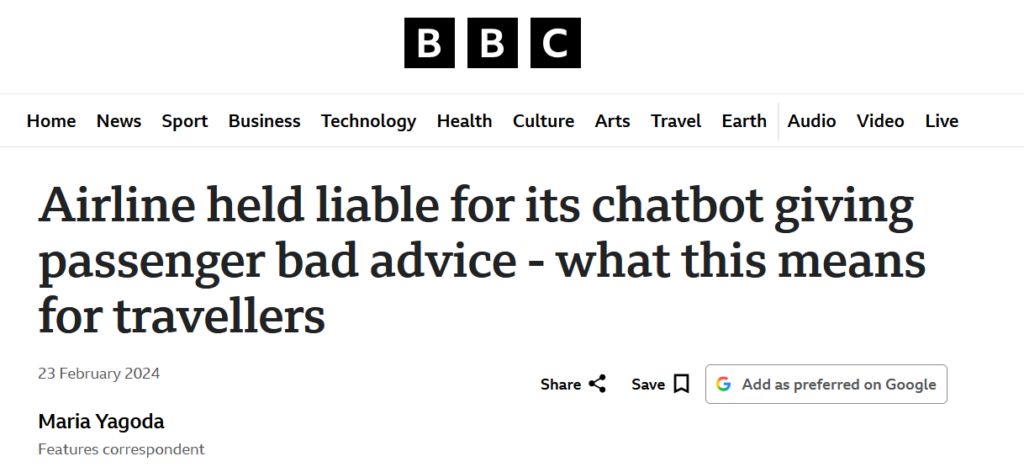 The BC Civil Resolution Tribunal found Air Canada liable for negligent misrepresentation after its chatbot gave a customer incorrect information about bereavement fares. Air Canada attempted to argue the chatbot was a separate legal entity responsible for its own actions. The Tribunal rejected this outright, ruling that the airline was responsible for all information on its website, whether it came from a static page or a chatbot.