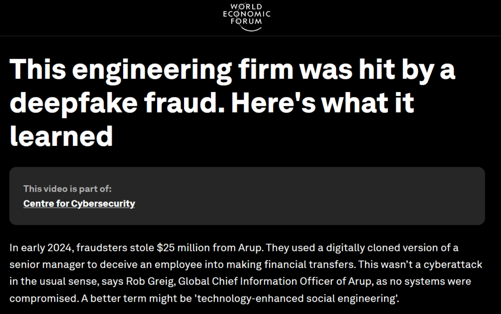 In early 2024, an Arup employee transferred $25 million to fraudsters after a video call in which every participant, including the CFO, was an AI-generated deepfake. No internal systems were compromised. The attack exploited human psychology and visual trust, not technical vulnerabilities.